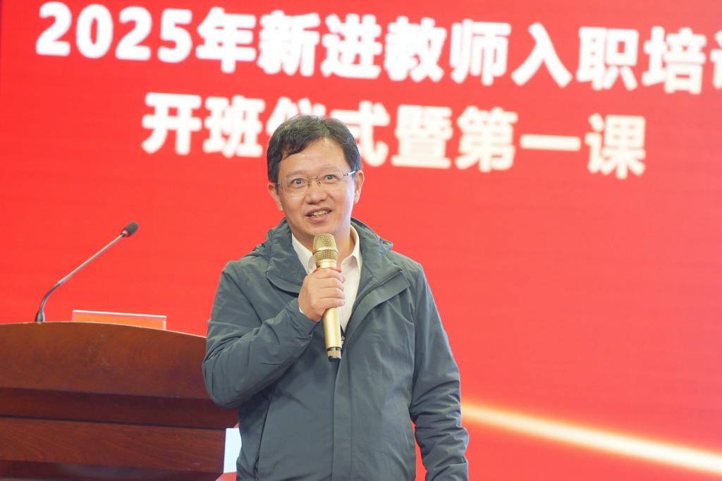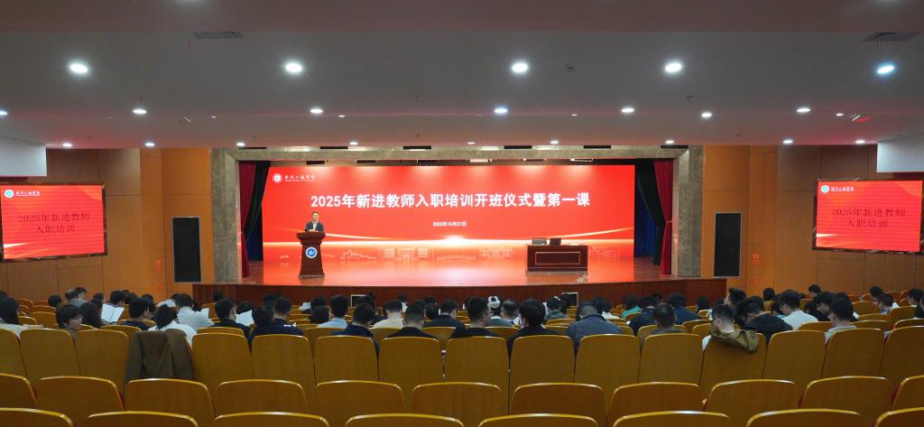 10月27日,2025年新进教师入职培训开班仪式暨第一课在阳明报告厅举行。校党委书记冯建波、校长邵千钧、副校长陈志荣,校党委委员、人事处处长陈晓平出席开班仪式。宣传部、教务处等相关部门负责人以及全体新教师参加。